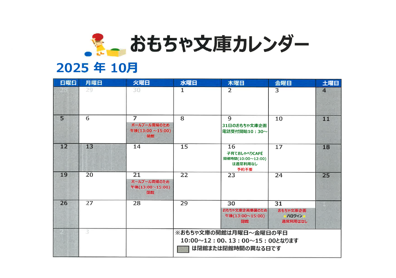 詳しくはおもちゃ文庫内に掲示を行っておりますので、ご確認ください。
