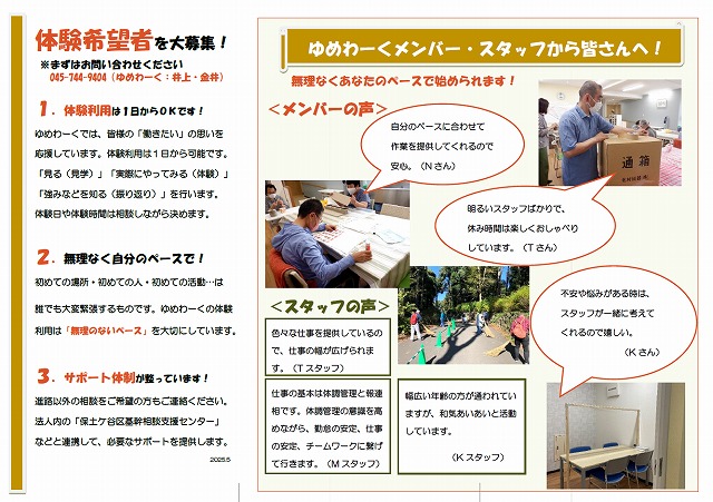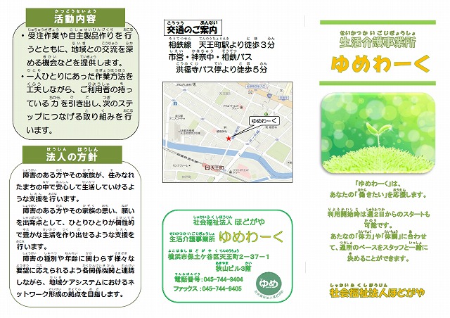 | 社会福祉法人 ほどがや 生活介護事業所 ゆめわーく 住所:横浜市保土ケ谷区天王町2−37−1 秋山ビル3F 電話:045-744-9404 FAX: 045-744-9405 |
