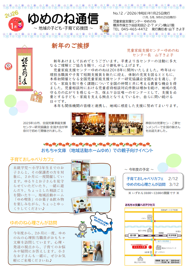 ![]() ←「ゆめ通信」124号 令和8年2月・3月号 初夢まつりの様子を掲載しています。 お休みのお知らせもありますので読んでみてください◎ |