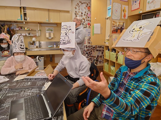 自分で色を塗ったハロウィンのお面をみんな被ってくれました!